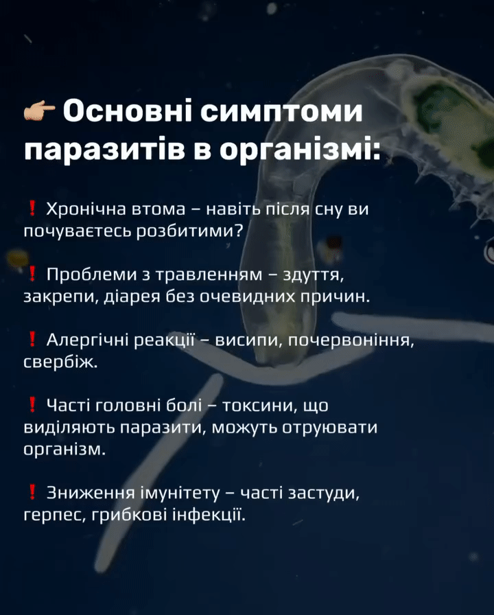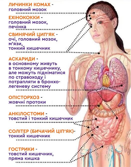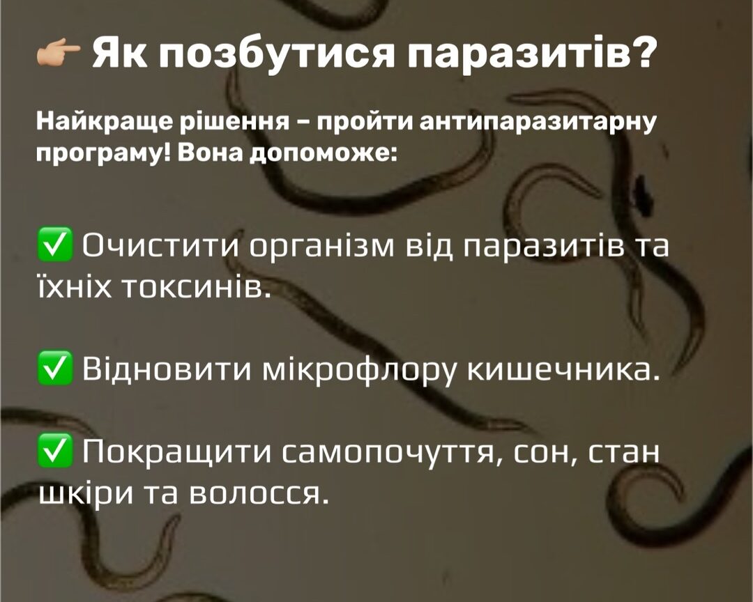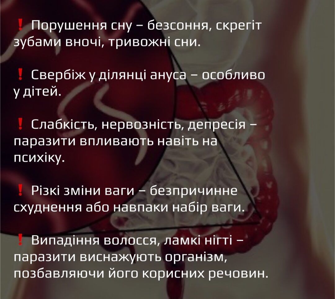 Гельмінти — це організми, що живуть усередині людини та харчуються її ресурсами. Вони можуть уражати кишечник, печінку, легені, мозок і навіть шкіру. Це призводить до збоїв у травленні, нервовій системі, висипань, слабкості й хронічної втоми.