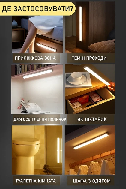 Цей світлодіодний світильник ідеально підходить для приліжкової зони, шафи з одягом, кухонних полиць, темних проходів або навіть туалетної кімнати. Завдяки компактному дизайну та бездротовій роботі його легко встановити саме там, де світло потрібне найбільше. А за потреби лампу можна зняти та використовувати як зручний ліхтарик.