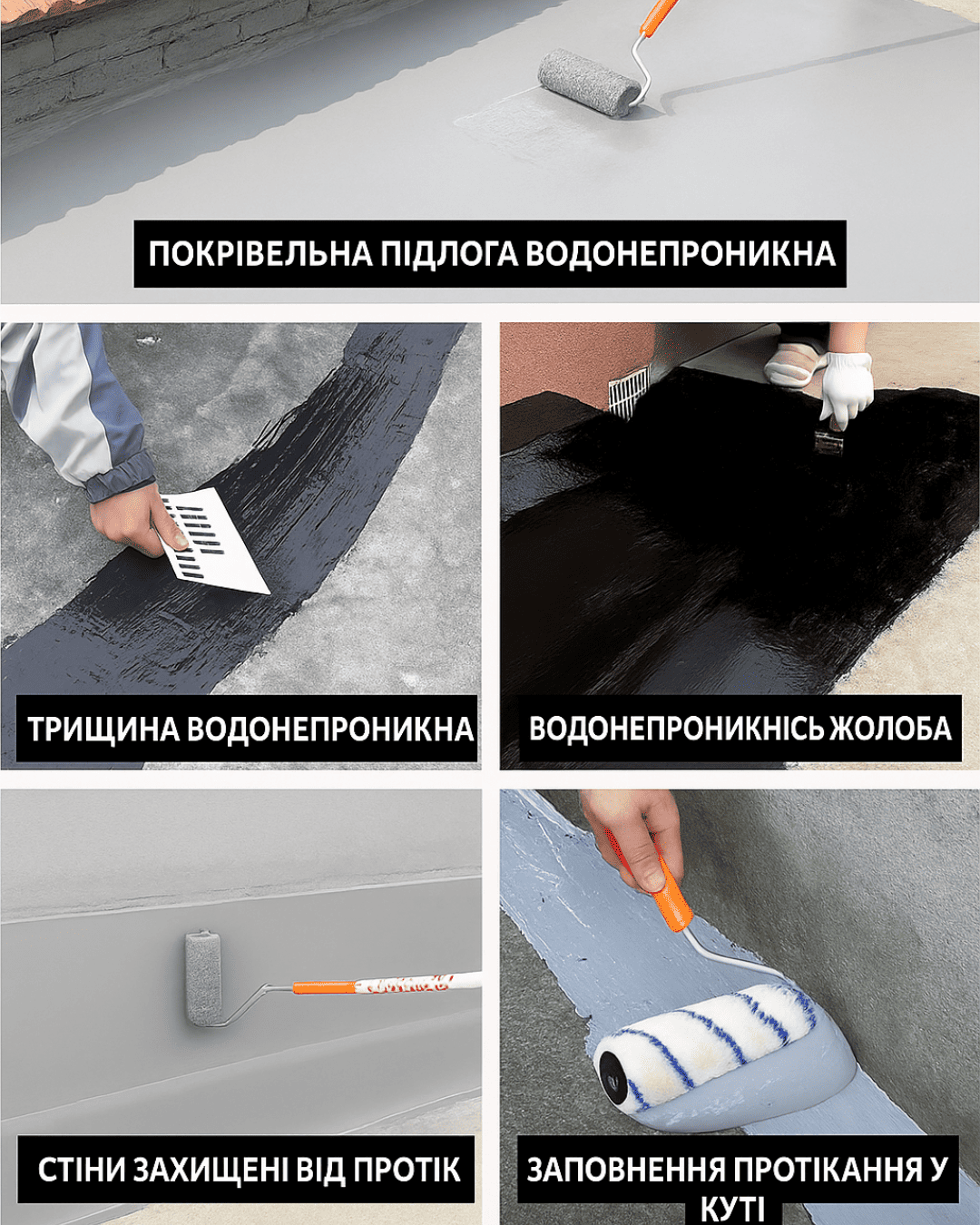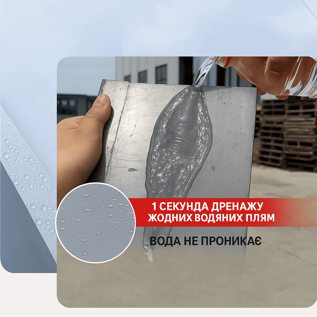 Утворює безшовний бар’єр, який миттєво зупиняє протікання та блокує проникнення води. Створює ідеальний захист для дахів, терас та підвалів, забезпечуючи повну сухість інтер’єрів.